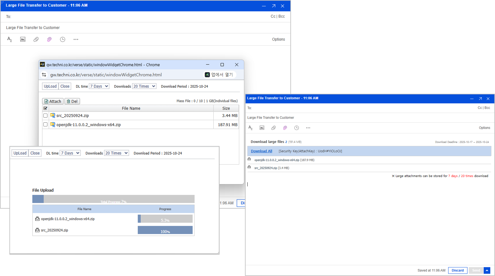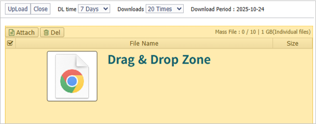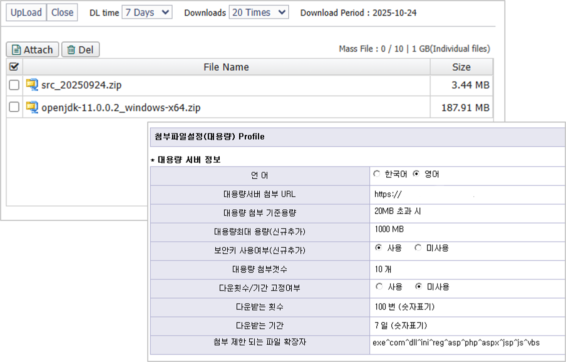발송일로 부터 첨부파일의 보존기간이나 다운로드 횟수를 관리자가 일괄 설정하거나, 사용자가 선택할 수 있도록 설정 할수 있으며,